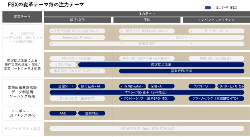 またEXBU FSXセクターでは、金融BUと重複するテーマもありますが、以下のCX/DX/AI活用等の注力テーマを掲げています。