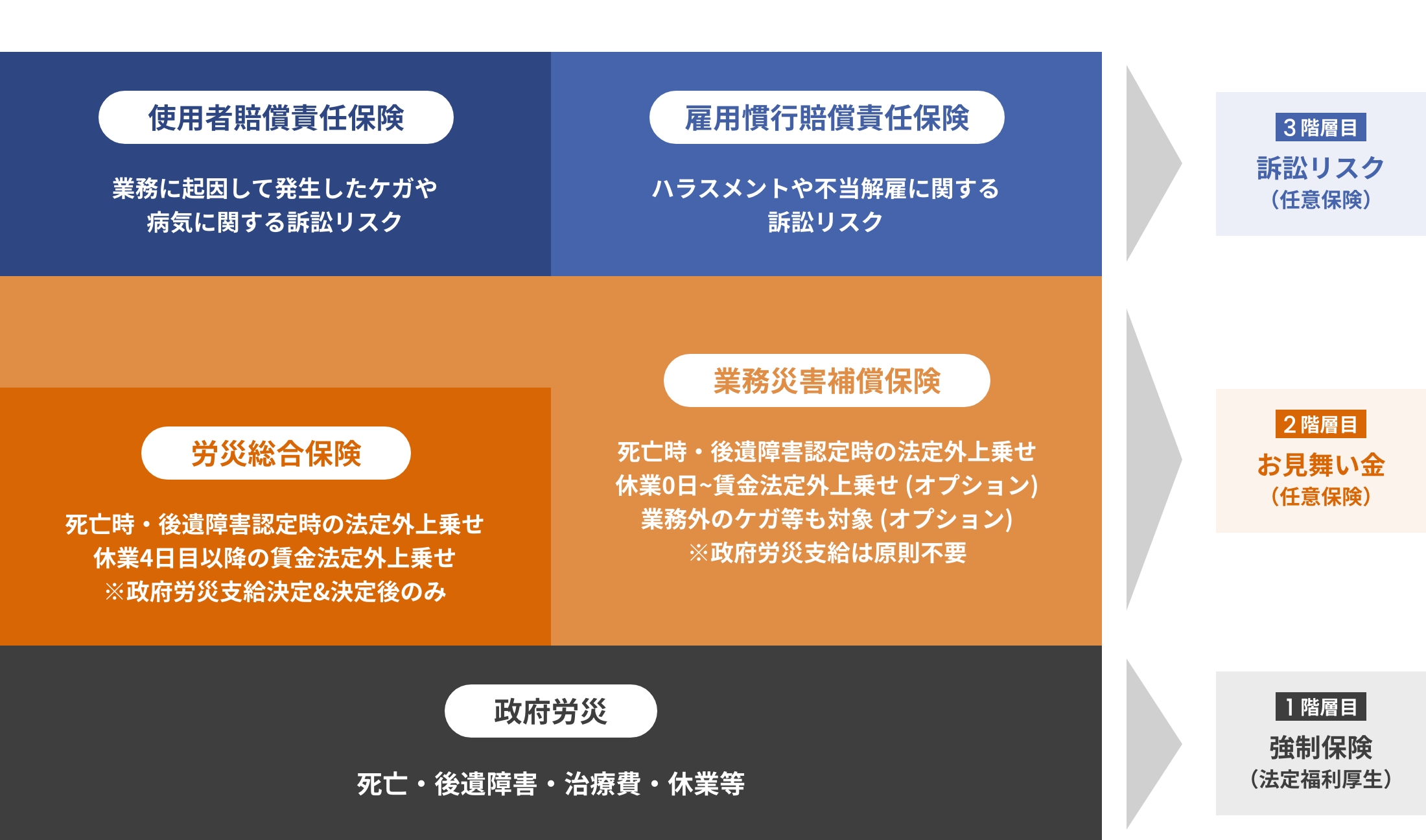従業員の業務上の災害にかかわる「従業員に対するお見舞金」「使用者としての賠償リスク」「雇用にかかわる賠償リスク」を貴社のニーズに合わせて補償します。業務中のケガについては政府労災と企業からのお見舞金などで対応することになりますが、その費用を労災総合保険や業務災害補償保険で備えることが一般的です。最近では、そのお見舞金では不十分であることを理由に従業員が企業を訴えるケースも増えており、その訴訟リスクに備えて、使用者賠償責任も注目されています。また、従業員からの訴訟として、パワハラ・セクハラ・不当解雇などの雇用トラブルで訴えられた場合にも補償されるような保険設計が可能です。