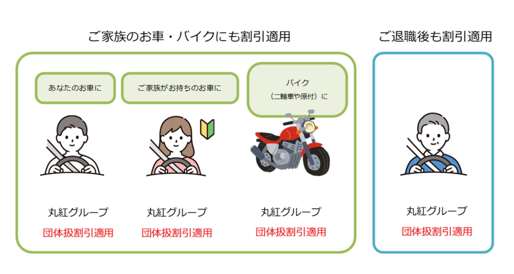 丸紅グループの大口団体扱割引は、令和7年1月1日から令和7年12月31日までの保険始期契約に適用されます。割引率は「ご契約台数」と「損害率」に応じて毎年算出され変動します。同居のご家族のお車も割引対象です。
