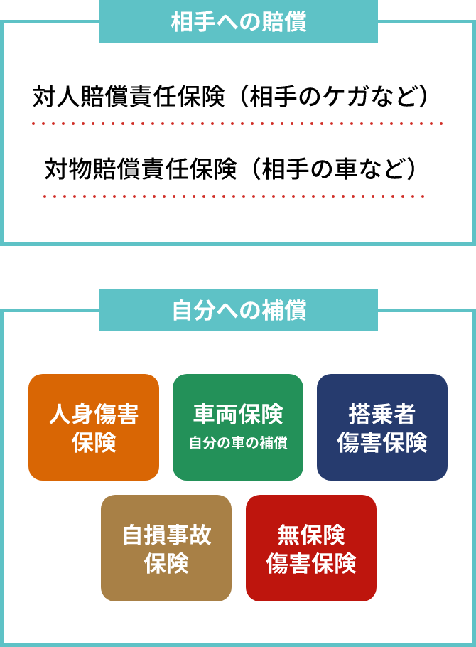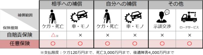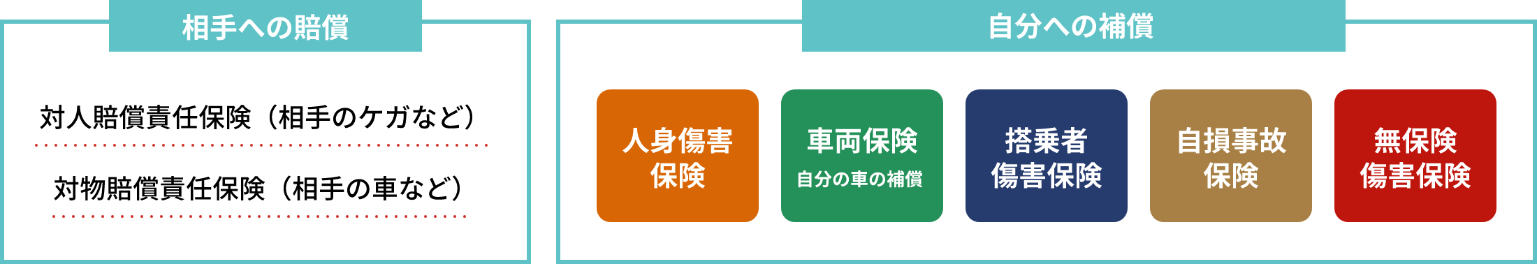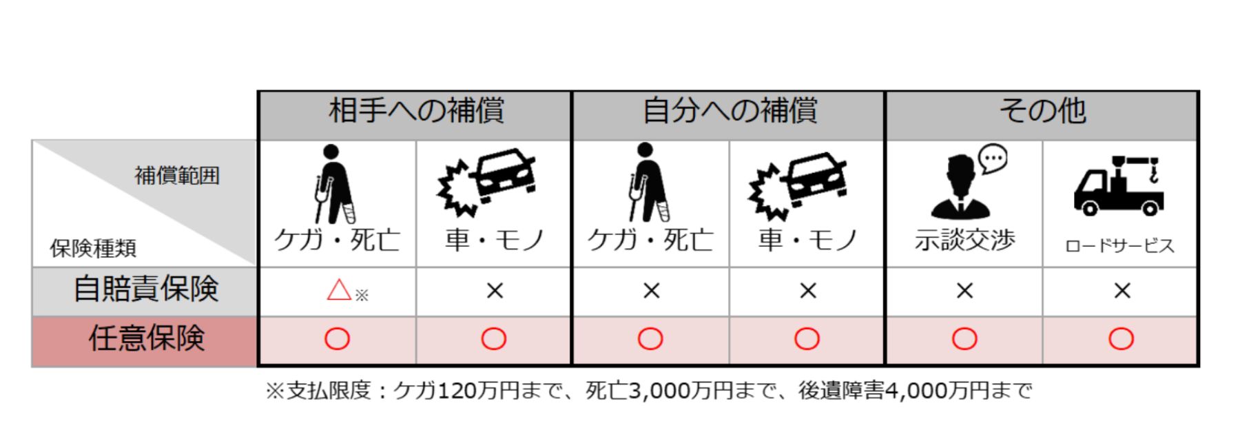 自賠責保険ではカバーしきれない各種の補償は、任意保険でカバーしましょう。
