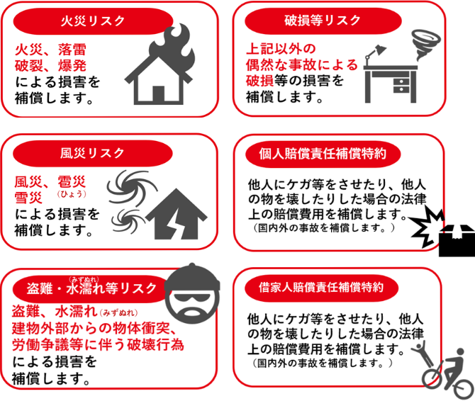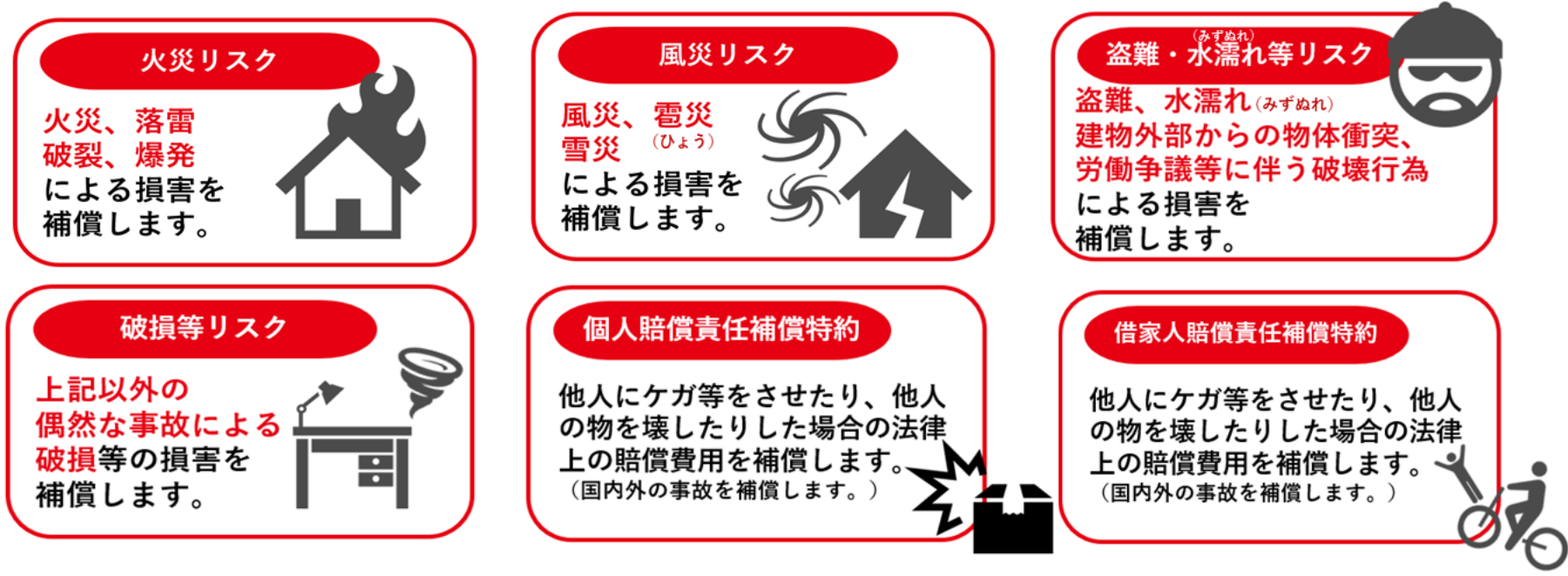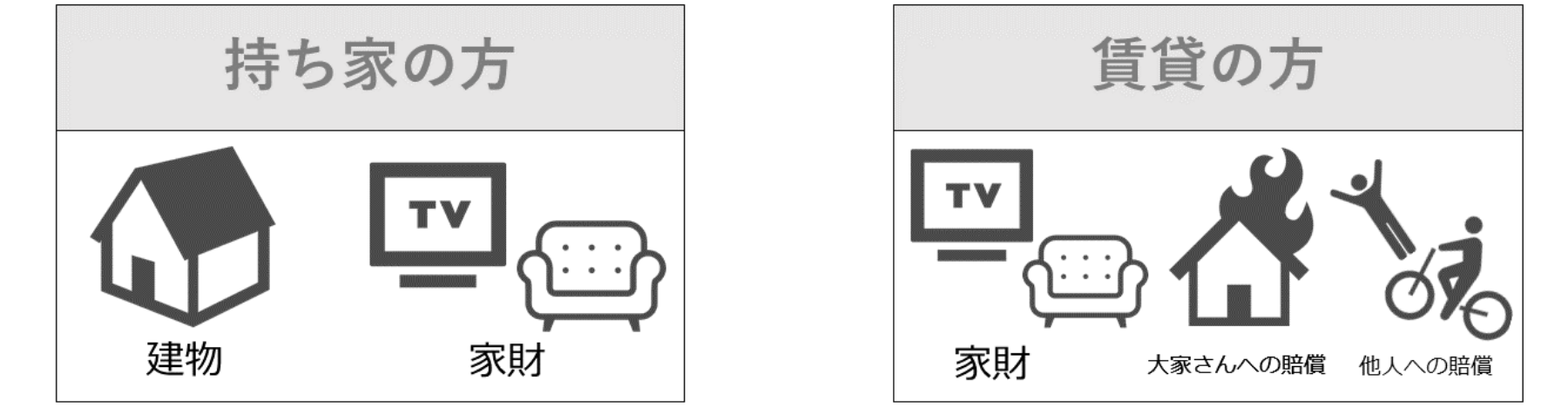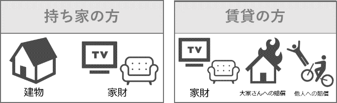火災保険の補償対象には建物と家財がありますが、持ち家の方、賃貸の方などお客さま一人一人にあわせて最適なプランをご提案させていただきます。
