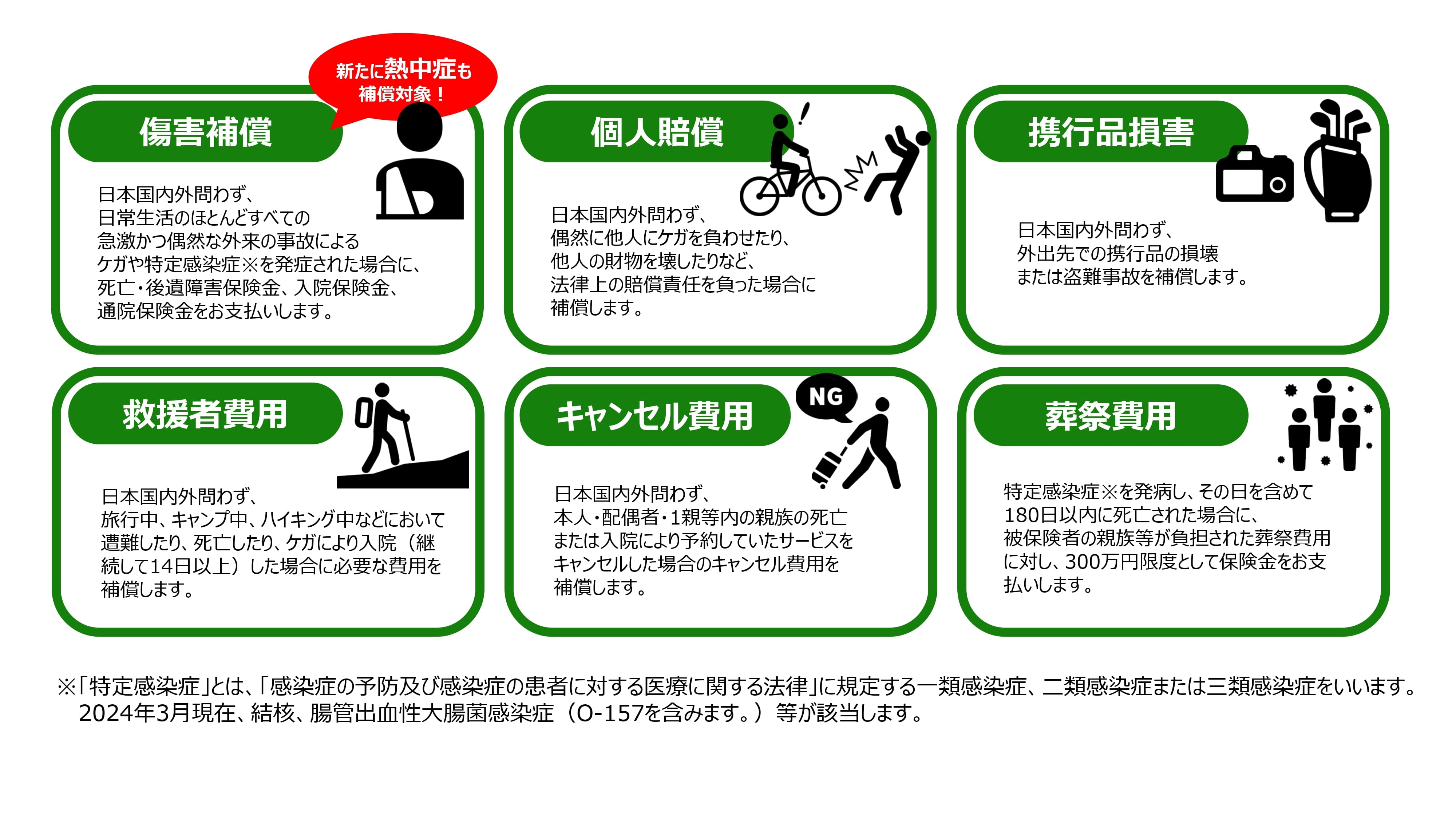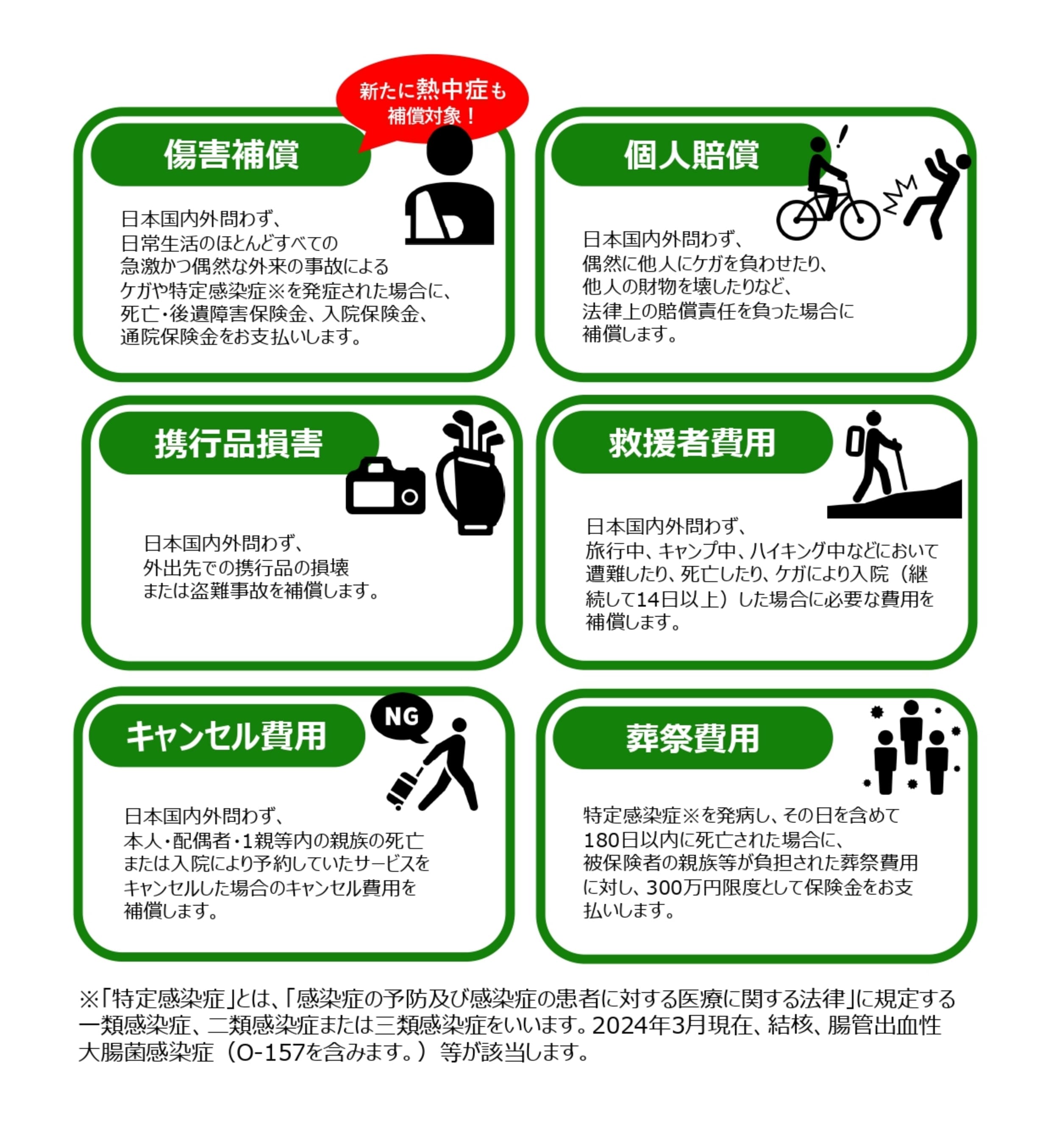 ※「特定感染症」とは、「感染症の予防及び感染症の患者に対する医療に関する法律」に規定する一類感染症、二類感染症または三類感染症をいいます。2024年3月現在、結核、腸管出血性大腸菌感染症(O-157を含みます。)等が該当します。